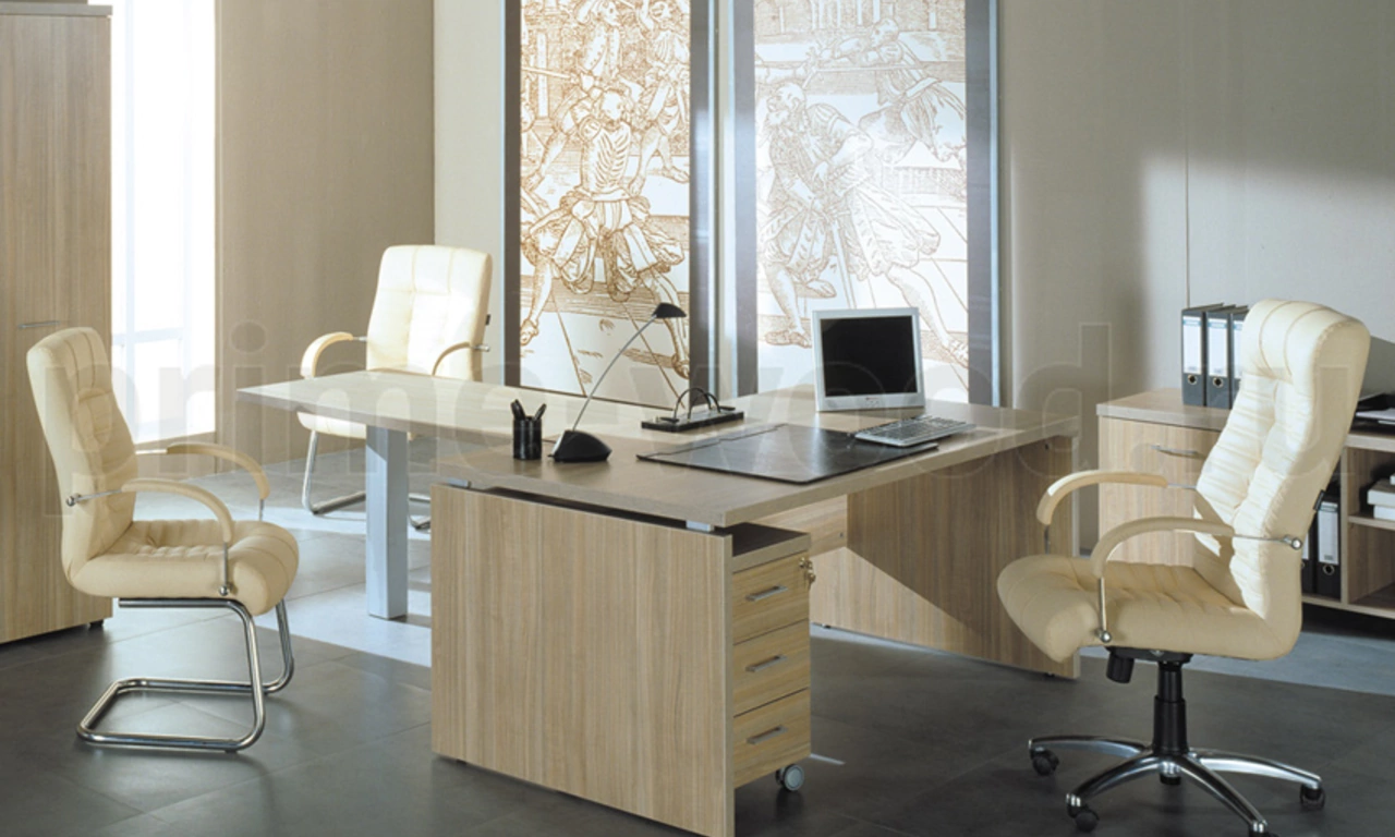 Материалы: Ламинированная ДСтП, кромка ПВХ. Столешницы столов и брифингов, боковые опоры столов, топы шкафов и тумб – 32 мм, кромка ПВХ 2 мм. Каркасы, двери и полки шкафов, каркасы и фасады ящиков тумб, экраны столов – 18 мм, кромка ПВХ 0,4 мм. Ручки – металлические, цвет – «сатин».