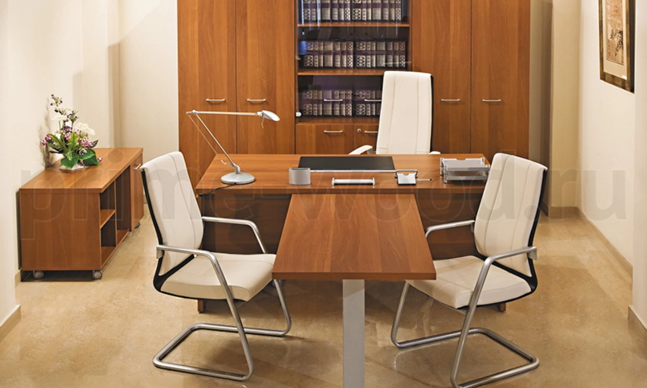 Большой выбор столов для переговорных зон разнообразных форм: прямоугольные, овальные, круглые. В составе кабинета присутствует модульная линейка переговорных столов на опорах-колоннах из нержавеющей стали. Наличие дополнительных элементов для обеспечения комфорта руководителя - фронтальные и боковые брифинги, журнальные столы.